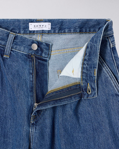 The EDWIN Bamba Pant features a loose fit with a high rise and roomy top block for comfortable wear. Made from 13oz Dane Blue Denim (100% cotton), it has a slight taper from the knees down, giving it a modern shape. The pant includes four pockets, double pleats at the front, tonal stitching, and a zip fly for classic style and functionality.