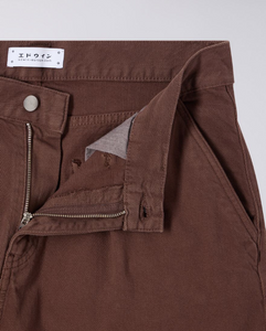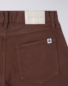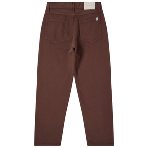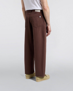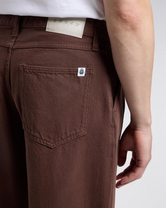 The EDWIN Bamba Pant features a loose fit with a high rise and roomy top block for comfortable wear. Made from 10.75oz Mopac PFD Denim (100% organic cotton), it has a slight taper from the knees down, giving it a modern shape. The pant includes four pockets, double pleats at the front, tonal stitching, and a zip fly for classic style and functionality.
